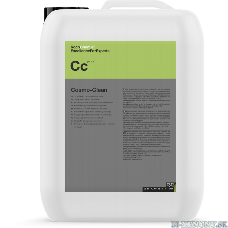 Prípravok na umývanie podláh - koncentrát Vybrané kombinácie umývacích; aktívnych látok a fosfátov zaručujú senzačné čistiace výsledky pri extrémne vysokom riedení. COSMO CLEAN sa používa hlavne pre zapečatené povrchy; pretože aj keď je povrch vlhký nehrozí pošmyknutie ba naopak zabezpečuje bezpečnú chôdzu. Povrch takto ošetrený veľmi rýchlo usychá. Umývacie aktívne látky vo výrobku sú viac ako z 90 % odbúrateľné. Ľahko alkalický charakter výrobku zaručuje dobrú znášanlivosť na všetky lakované povrchy a jeho ďalšie výhody sú pri predpisoch o bezpečnosti práce a ochrany zdravia. COSMO-CLEAN je extrémne nízko penivý; silne riediteľný bezpečnostný čistič pre profesionálne základné a udržiavacie čistenie podláh pomocou všetkých dostupných čističiek podláh; kefových aj pádových. Na základe dobrých čistiacich vlastností sa môže COSMO-CLEAN používať aj na manuálne čistenie; kde sú povrchy znečistené pigmentmi alebo mineráliami; ktoré je nutné odstrániť. Okruh použitia: Priemyselné budovy; správne budovy; autodielne a parkovacie garáže. Riedenie: