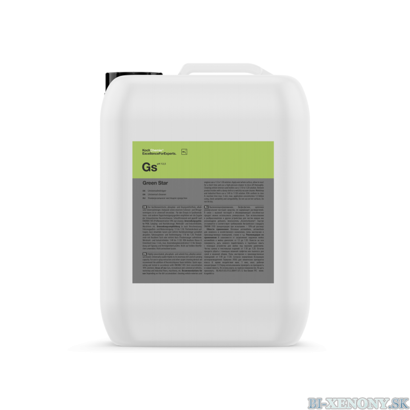 Vysoko účinný univerzálny čistič; ktorý je vhodný na čistenie exteriéru vozidla aj na silne znečistený interiér vozidla. Veľmi dobre odstraňuje zaschnutý hmyz. Green Star nenarušuje a nezmýva vosky a keramické ochrany. Nepoškodzuje chrómované; eloxované a lakované (čierne) lišty. Neobsahuje fosfáty ani rozpúšťadlá. Vhodný ako na ručné; tak vysokotlakové umývanie vozidiel. Veľmi úsporný a výkonný čistiaci prostriedok. Oblasť použitia: ručné umývanie osobných automobilov (interiér; exteriér) Veľmi dobre odstraňuje zaschnutý hmyz a rozpúšťa mastnotu a silné znečistenie na textíliách v interiéri.