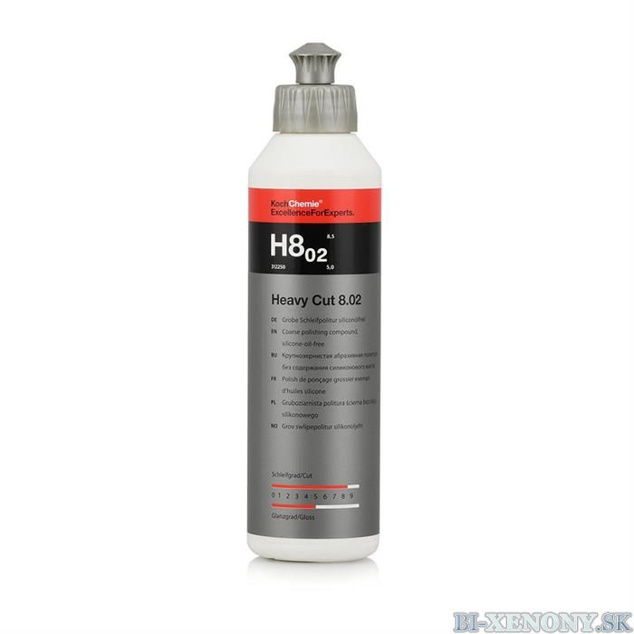 Inovatívna strojová pasta na rýchle spracovanie silne zvetraných lakov; odstraňovanie hlbokých škrabancov a efektívne odstraňovanie lakovacej hmly a nábrusov až do zrnitosti 1 500. Vďaka extrémne homogénnemu brúsnemu zrnu vytvára Heavy Cut 8.02 mimoriadne vysoký výbrus. Dá sa pri nízkej tvorbe prachu dlho leštiť bez nalepenia. Hodí sa výborne pre všetky druhy lakov (ako mäkké; tak aj odolné proti poškriabaniu).