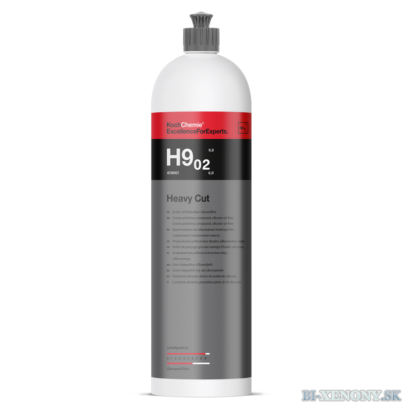 Inovatívna brúsna leštiaca pasta pre rýchle spracovanie silne zvetraných lakov; odstraňovanie hlbokých škrabancov a efektívne odstraňovanie lakovacej hmly až do zrnitosti 1 200. Vďaka extrémne homogénnemu brúsnemu zrnu vytvára Heavy Cut 9.02 mimoriadne vysoký výbrus Stupen 9 pri veľmi dobrom stupni lesku stupeň 6. Hodí sa výborne pre všetky druhy lakov (ako mäkké; tak i odolné proti poškriabaniu)