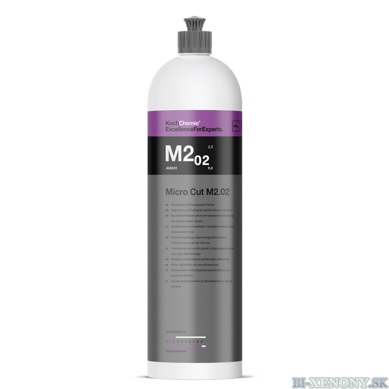 Antihologramová pasta s vysoký leskom Micro Cut M3.02 je pasta s mikročasticami pre strojové leštenie najnovšej generácie na trvalé odstránenie stôp po leštení; hologramoch; jemných škrabancoch až do zrnitosti o veľkosti 4 000 pre všetky druhy lakov (vrátane odolných proti poškriabaniu). Vďaka použitiu vysoko špecializovaných a extrémne homogénnych brúsnych telies sa dosiahne dokonca na tmavých a podobne citlivých farebných odtieňoch pri extrémnych svetelných podmienkach brilantný a trvanlivý vysoký lesk povrchu. Hologramy a jemné škrabance sa mechanicky odstránia. Antihologramová pasta s vysokým leskom Micro Cut M3.02 je obzvlášť výdatná; dá sa dobre vyleštiť a bezo zvyškov odstrániť.