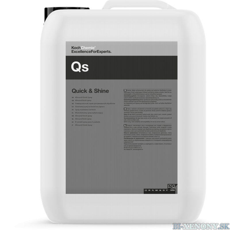Všestranný talent na všetky hladké a lakované povrchy (autolaky; lakované drevo; sklo; plastové diely; kokpit; lakovaný nábytok a hudobné nástroje; povrchy z ušľachtilej ocele atď.). Čistí; ošetruje a konzervuje len v jednom pracovnom kroku. Farba povrchu sa prehĺbi a brilantný lesk bez šmúh. Otlačky prstov a mierne znečistenie sa odstráni rýchlo a jednoducho. Ošetrené diely budú odpudzovať vodu a nečistoty a budú tak chránené pred opätovným rýchlym znečistením (efekt lotosového kvetu). Quick & Shine sa rýchlo rozotiera; takže sa s ním jednoducho pracuje. Politúry a vosky; ktoré boli nanesené predtým; zostávajú zachované. Vhodný predovšetkým pre rýchlu úpravu vystavovaného tovaru vo výstavných priestoroch alebo na veľtrhoch; ako aj pre rýchlu úpravu vozidiel.