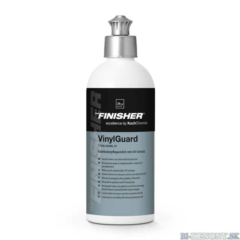 Koch Chemie The Finisher VinylGuard je produkt určený na starostlivosť o čalúnenie, ktorý zároveň poskytuje ochranu pred UV žiarením. Je vhodný na kožené aj syntetické povrchy, kde pomáha obnoviť pružnosť materiálu, osviežiť jeho pôvodnú farbu a zlepšiť celkový vzhľad.