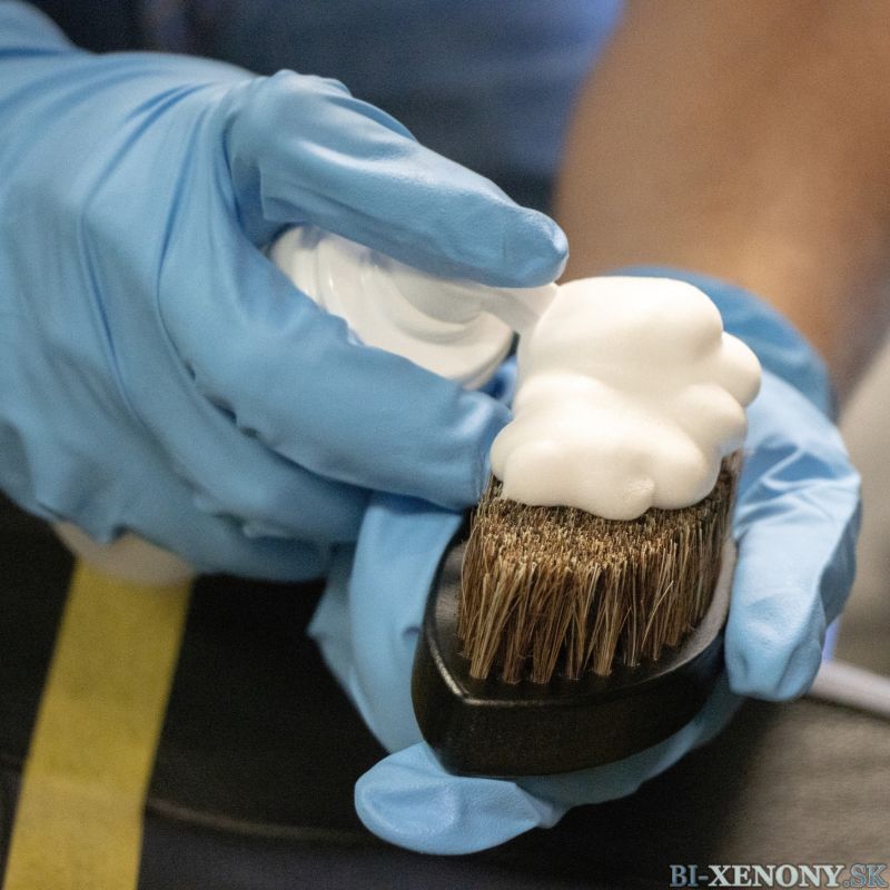 Nalejte čistič do penového dávkovača a vytvorte penu. Penu naneste na kefku alebo priamo na povrch. Jemne krúživými pohybmi vyčistite kožu alebo textil. Nevyvíjajte príliš veľký tlak, aby nedošlo k poškodeniu povrchu.