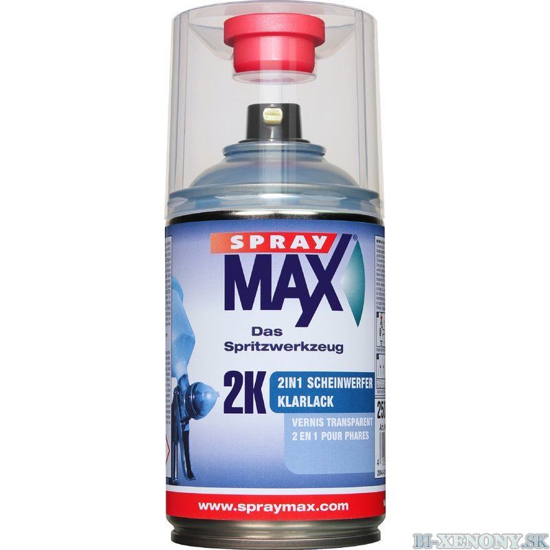 - BEZFAREBNÝ LAK 2in1 - Ako prvú aplikujte veľmi tenkú vrstvu (rozprašok) bezfarebného Spray Max 2K 2in1 laku na odmastnený a suchou a čistou utierkou preleštený povrch. Vzápätí aplikujte už plný nástrek plynulým ťahom aby sa vytvorila tenká číra vrstva. Nechajte cez noc uschnúť pri teplote cca 20°C. V prípade; že povrch nie je perfektne hladký (zima; prievan; prach; stekance) preleštite leštiacou pastou